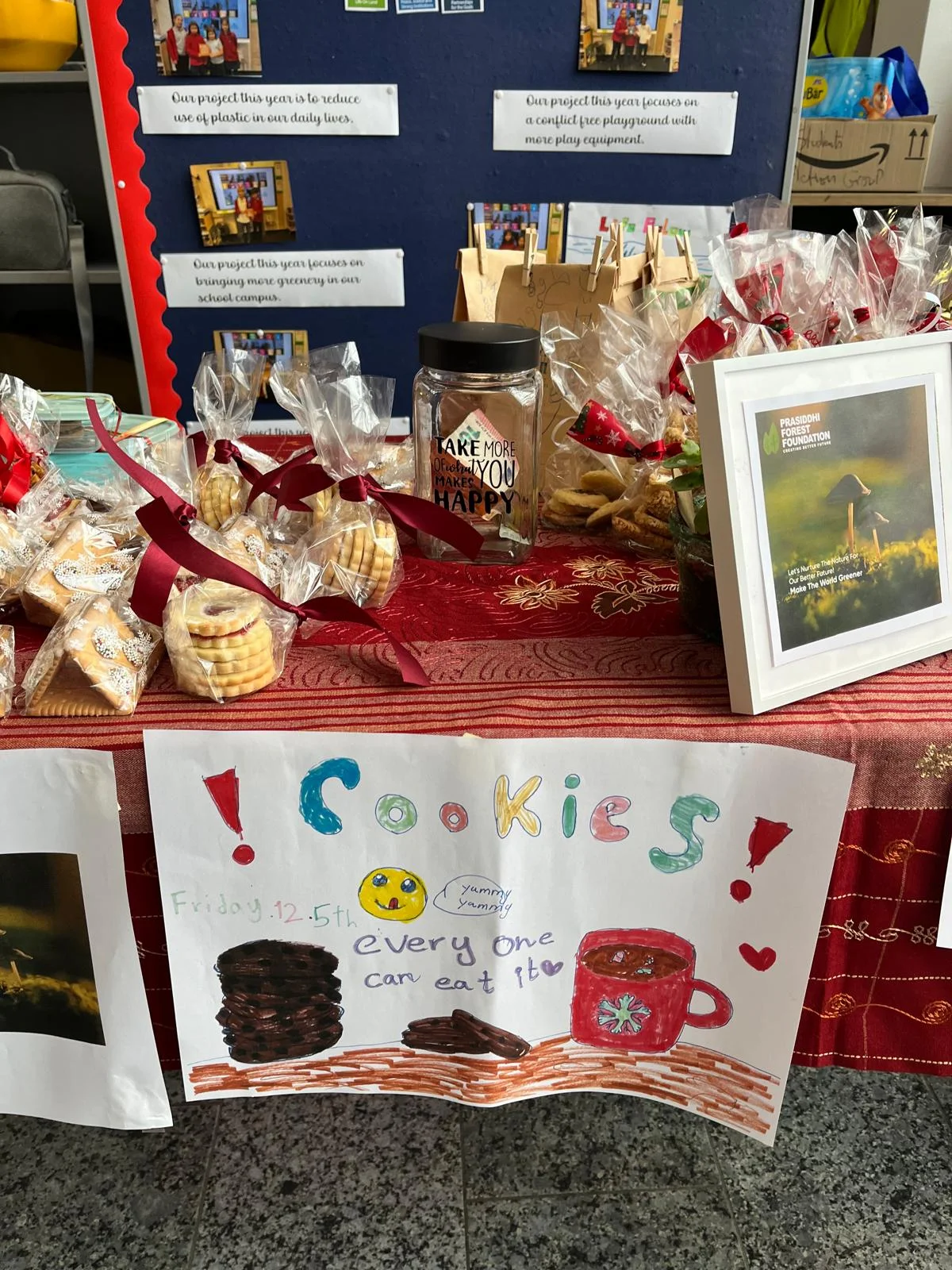 On the big day, 5 Dec, Winter market at SIS, the tables were set, and so was the mood. To our surprise, there were 3 boxes full of cookie bags brought in by so many of our lovely parents, so beautifully decorated and looking delicious! The SAG members were super excited as the sale began, our bake sale was catching up, and the students were getting thrilled to see the money jar filling up. With a tremendous sale, we easily reached our target of 300 euros! However, we still had a box of cookie bags to sell. The following week, the students took it upon themselves to set a table in the foyer, shouting out and inviting parents and students to buy more cookie bags. They did have to bring down the prices for the bags, as now the intention was to sell them off rather than make a profit.